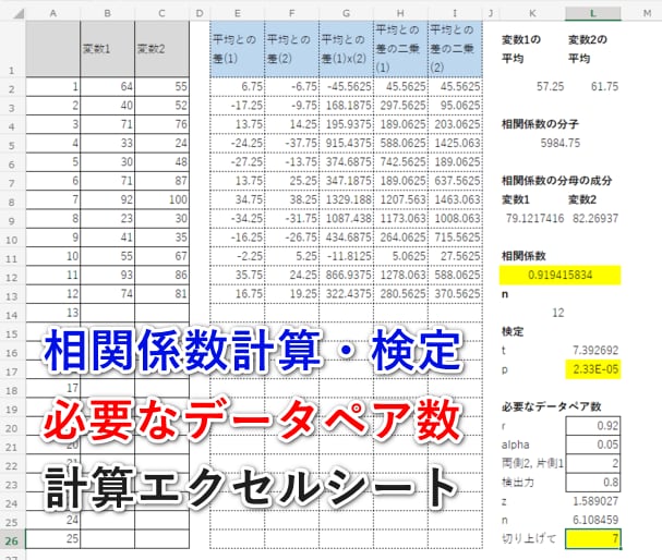相関係数の計算、検定、相関係数計算に必要なデータペア数(サンプルサイズ)計算のためのエクセルシートです。こちらに解説記事があります。https://best-biostatistics.com/toukei-er/entry/sample-size-determination-for-correlation-coefficient/